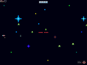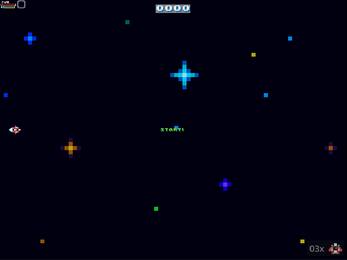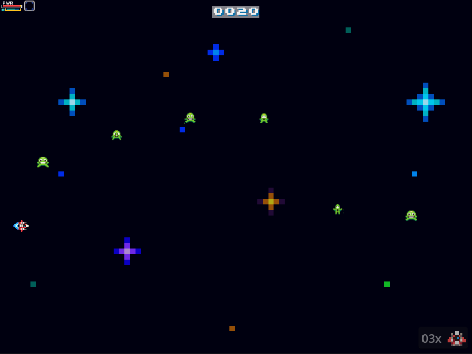 - Power-up, sempre que matar um inimigo, haverá uma chance de um power-up ser dropado, ele preenche a segunda barra de poder que permite até 10 tiros, sua nave fica duas vezes mais rapido e o seu tiros carregam duas vezes mais rapidos.